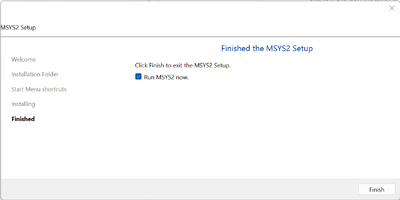 Nach Abschluss der Installation starten Sie MSYS2, indem Sie die Option „Run MSYS2 now“ beibehalten und auf „Finish“ klicken: